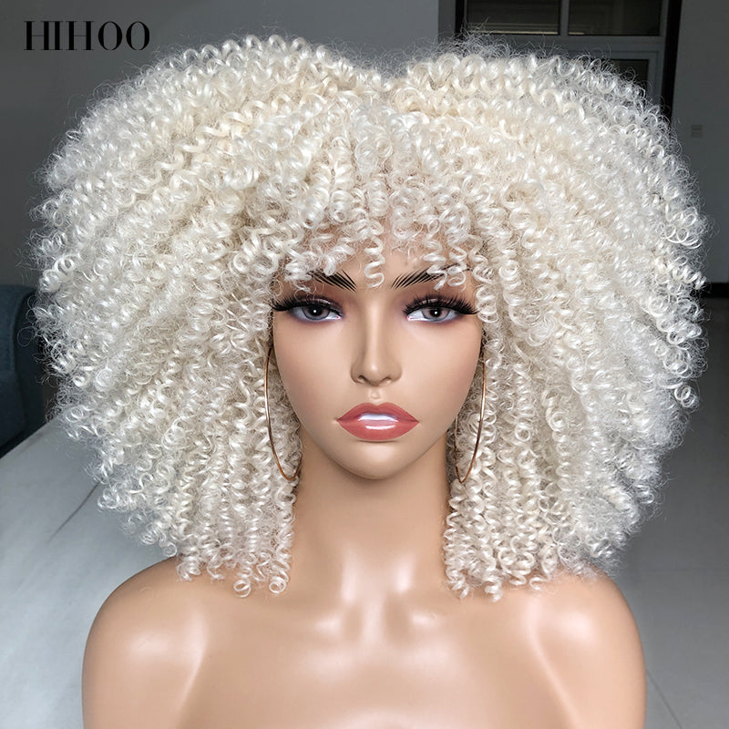 Short Afro Kinky Curly Wig With Bangs For Black Women Cosplay Lolita Natural Hair Ombre Mixed Brown Synthetic African Wigs